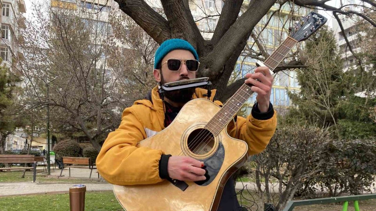 Eskişehir’de soğuk hava şartlarına aldırış etmeden sokak müzisyenliği yapan Odin Sarbazi, aynı anda hem mızıka hem de gitar çalarak kendisini seyredenlere keyifli anlar yaşatıyor.