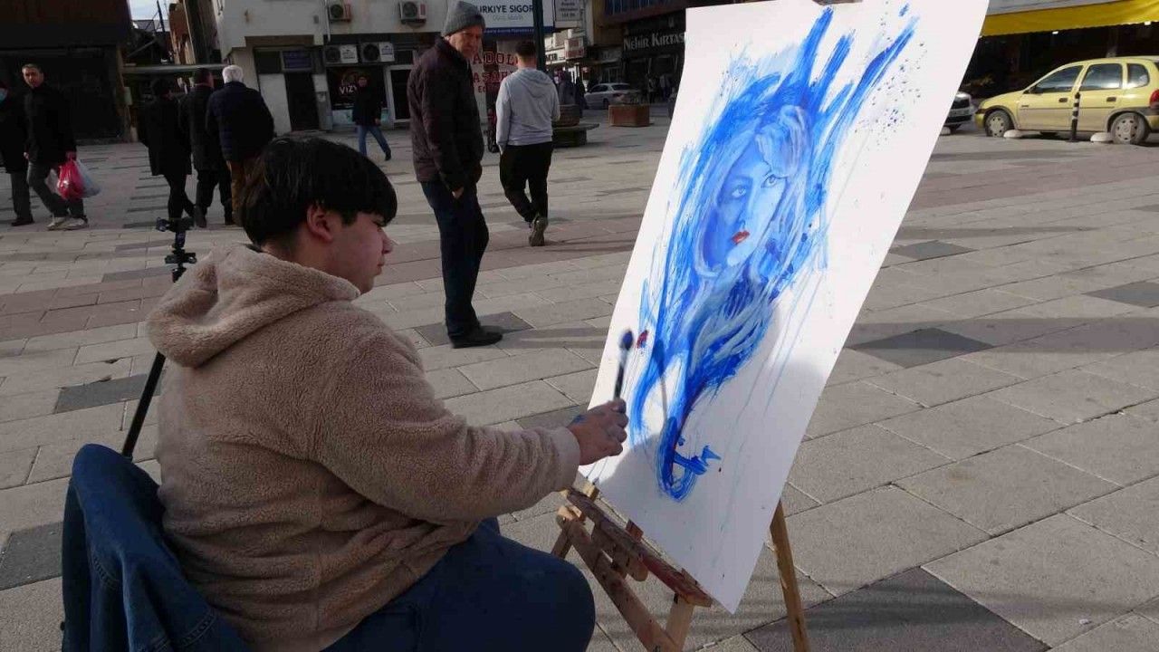 Sorgun Şakir Efendi Meydanı’nda farkındalık oluşturmak için malzemelerini alarak resim çizen Enes Külekçi, meydandan geçenlerin takdir cümleleri eşliğinde çizimini gerçekleştirdi. Önümüzdeki günlerde yeni resim sergisi açmak için planları olduğunu söyleyen Enes, kadınların yaşadığı sorunlara dikkat çekmek istiyor. Enes, "Kadınların geçmişten bugüne ayakta kalmak için her şeyi yapmaları ilgimi çekiyor. Mesela anneannemin çektiği sıkıntıların bana etkisi oldu. Çizimlerim konusunda fikir verdi. Eskiden kadınlar, özellikle köylerde çok zorluklar yaşıyordu. Kadınların sesi olmak istiyorum. Açmak istediğim sergiye bu toplumsal sıkıntıların farkında olan herkesten destek bekliyorum" dedi.