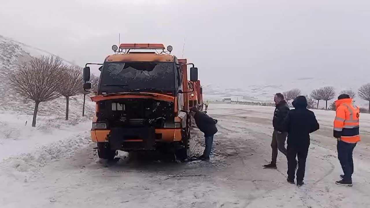 Sivas’ta seyir halindeki BMC marka karla mücadele kamyonu, yanarak kullanılamaz hale geldi.
