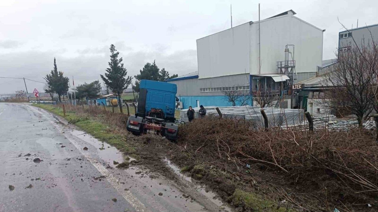 Tekirdağ’ın Muratlı ilçesinde yağışlardan dolayı kayganlaşan zeminde sürücünün direksiyon kabiliyetini kaybetmesi sonucu yoldan çıkan tır kaza yaptı.